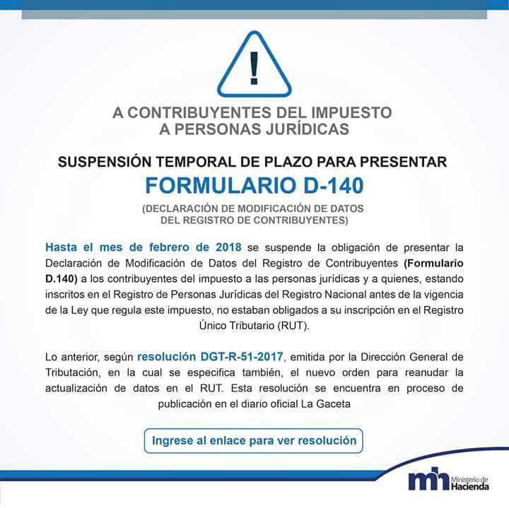 The Costa Rica Tax Department ( Tributación Directa) has extended the filing deadline for the D 140 form.