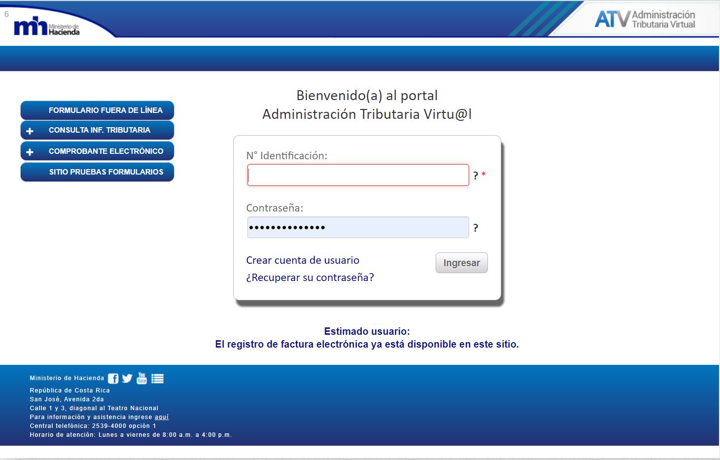 The Ministry of the Treasury of Costa Rica has an online portal called the virtual tax administration or Administracion Tributaria Virtual in Spanish and which you can access at https://www.hacienda.go.cr/ATV/Login.aspx