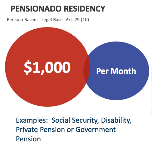 The Pensionado (Retiree) applicant must demonstrate a lifetime pension source of income of at least US$1,000 per month. The typical applicant in this category has a government, private sector pension or social security retirement benefits. The legal basis for the pensionado category under the immigration law is Article 81 of Law 8764.