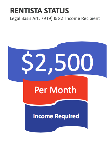 To apply for residency under the Rentista category (Article 82), the applicant must show that they will receive at least US$2,500 per month of income in a permanent, stable and irrevocable manner for at least 2 years. This category includes the applicant, their spouse and all their children which are under the age of 25.