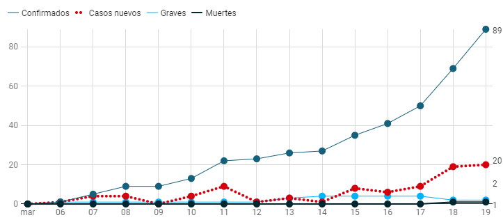 In Costa Rica, as of March 19, 2020, there are 87 confirmed cases of Covid 19 (35 women and 52 men), and they are spread out in six out of the seven provinces of Costa Rica. There have been two deaths reported so far.